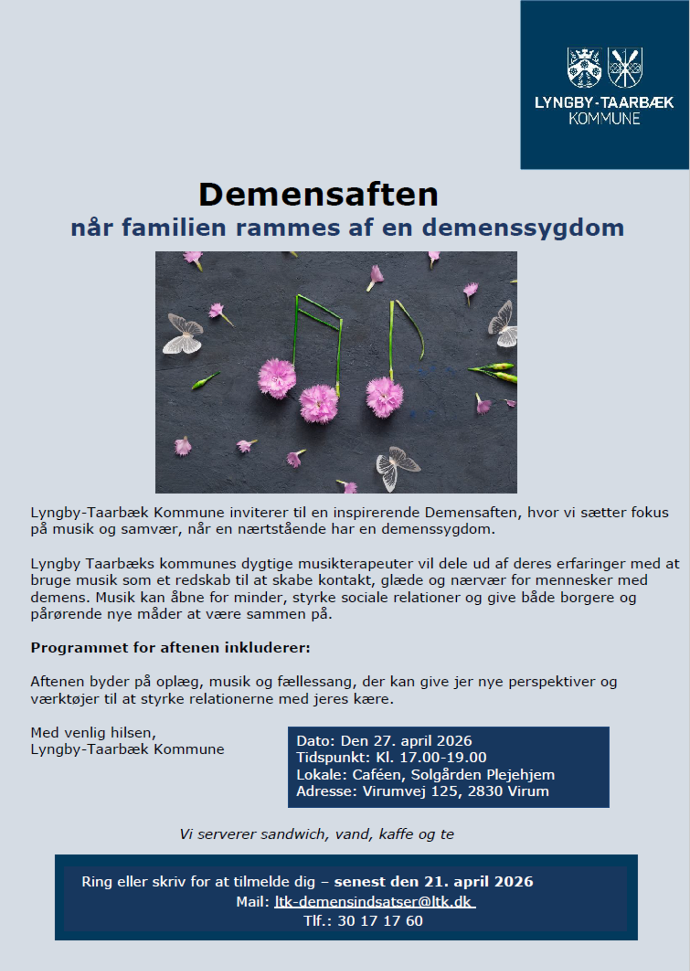 Lyngby-Taarbæk Kommune inviterer til en inspirerende Demensaften, hvor vi sætter fokus på musik og samvær, når en nærtstående har en demenssygdom.