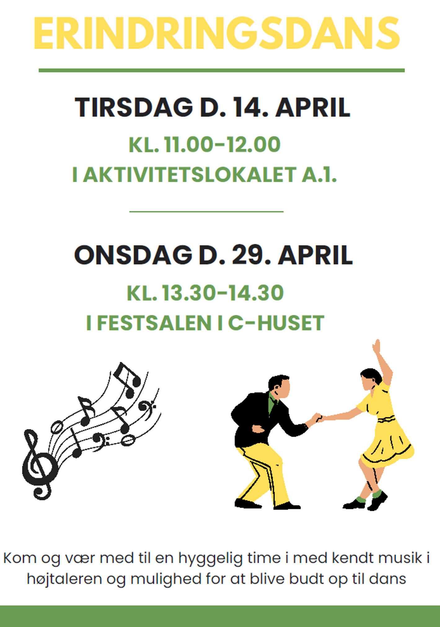 Erindringsdans i april For alle interesserede. Tilmelding 14. apr. 2026 11:00 Aktivitetslokalet Hus A 1. sal 29. apr. 2026 13:30 Festsalen Hus C