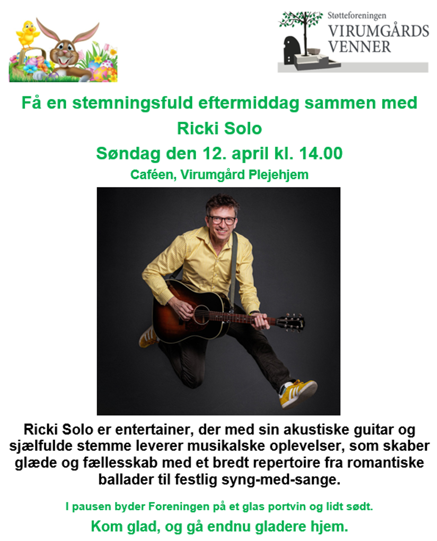 Ricki Solo er entertainer, der med sin akustiske guitar og sjælfulde stemme leverer musikalske oplevelser, som skaber glæde og fællesskab med et bredt repertoire fra romantiske ballader til festlig syng-med-sange.