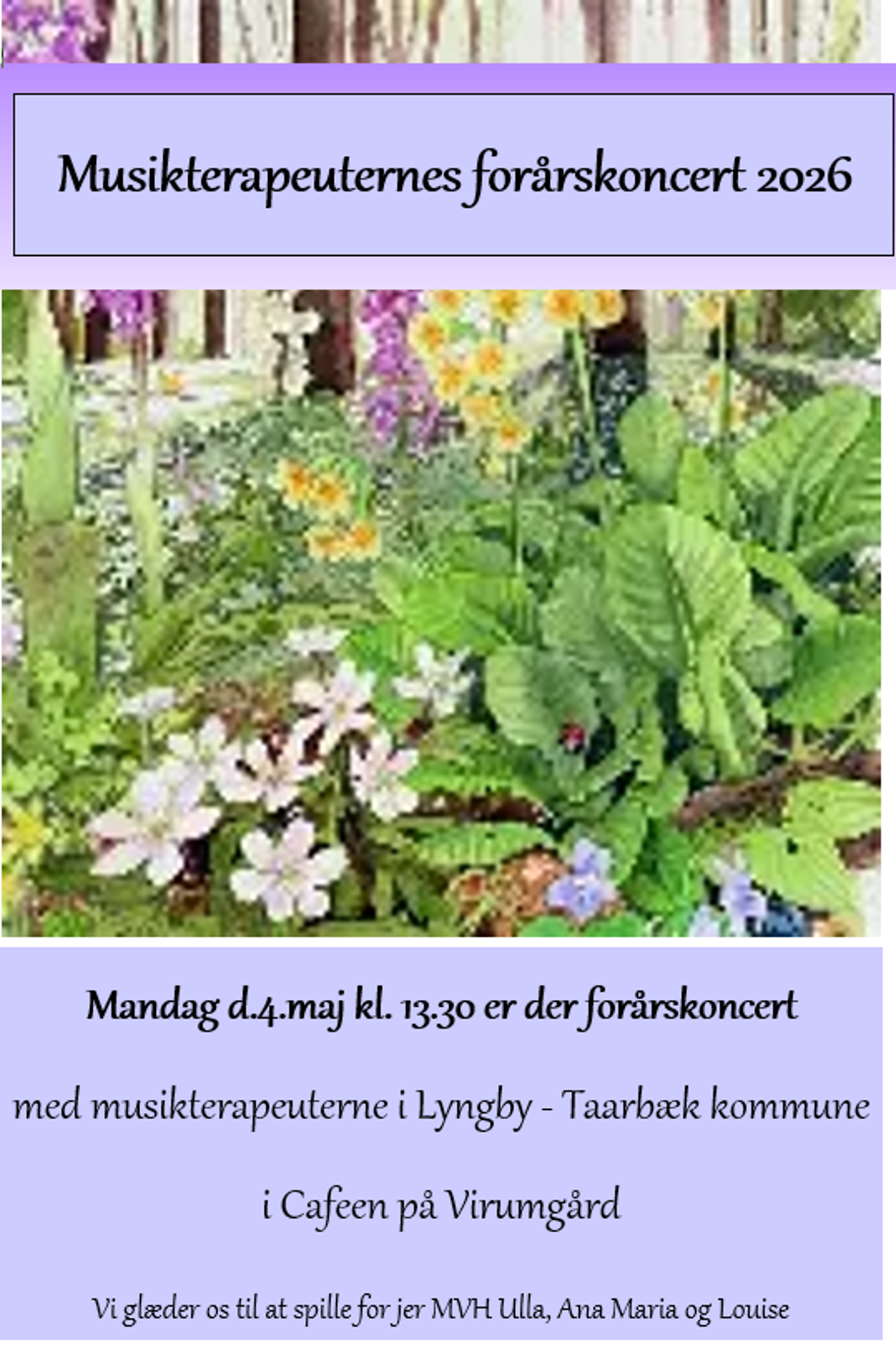 Musikterapeuternes forårskoncert 2026 For alle interesserede. Oversigt 04. maj 2026 13:30 -14:30 Caféen